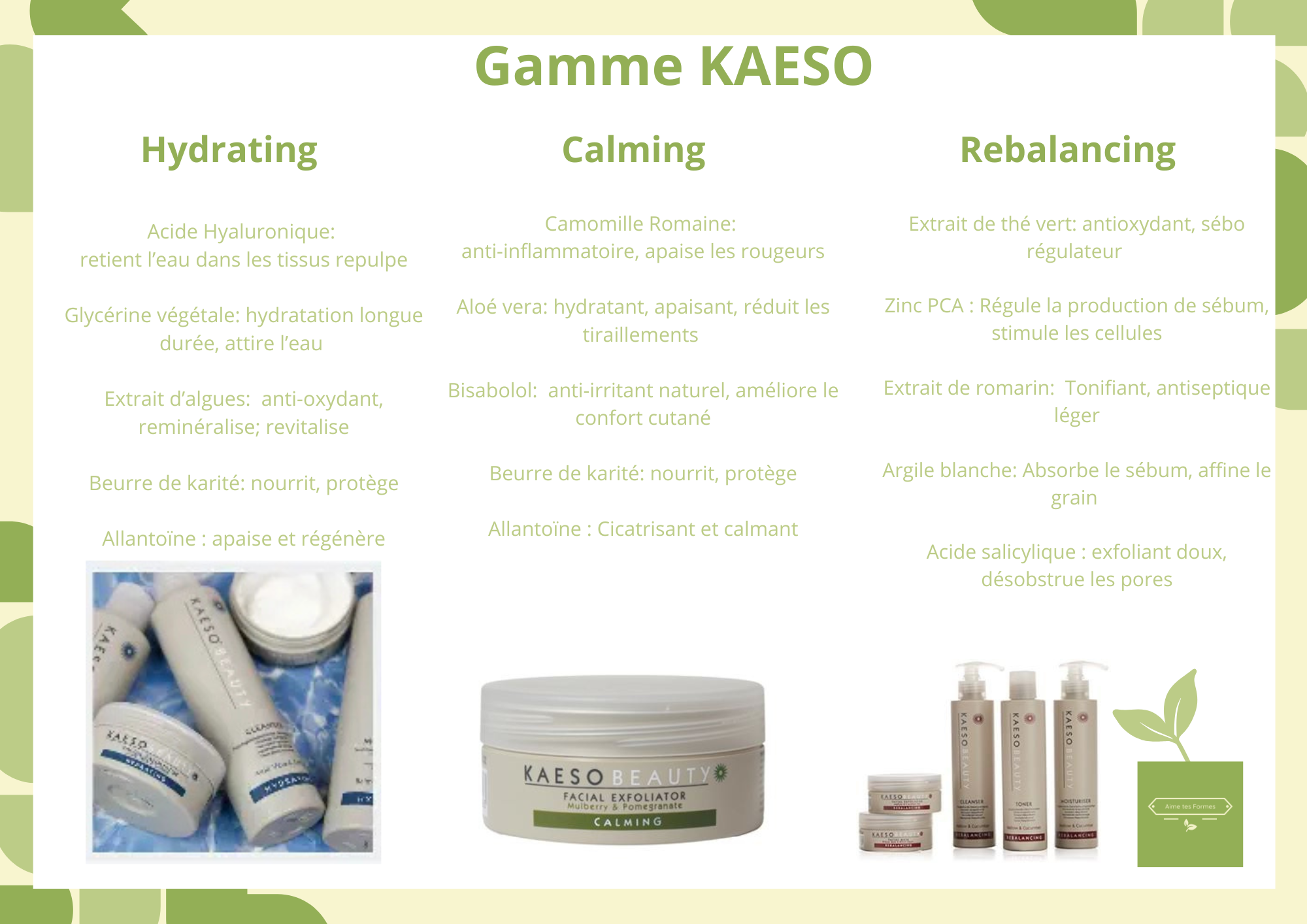 Un kit beauté ingénieux et ultra-complet regroupant les rituels de soin essentiels pour l’entretien et l’éclat de la peau. Ces soins professionnels doux sont adaptés aux besoins de chaque type de peaux : nourrir, équilibrer, hydrater ou encore protéger. Chaque gamme pour le visage de la marque Kaeso correspond à une nature de peau singulière permettant de les traiter et de les embellir selon leur besoins spécifiques.